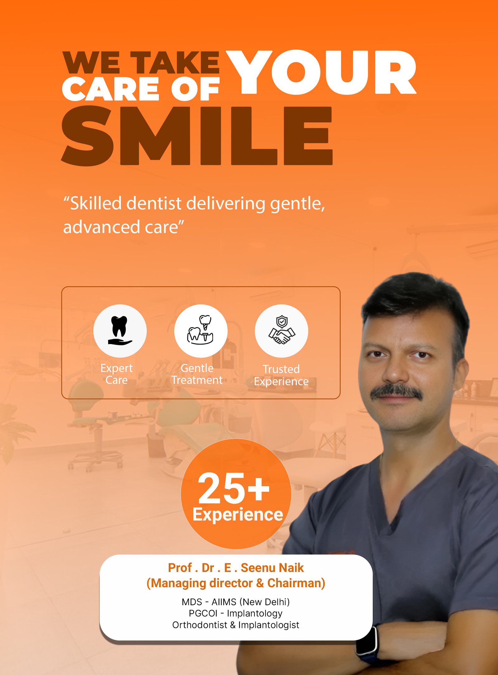 Prof. Dr. E. Seenu Naik, MDS-AIIMS New Delhi., is a distinguished Orthodontist and PGCOI-certified Implantologist. He brings extensive academic knowledge and clinical expertise to advanced orthodontic and implant treatments.